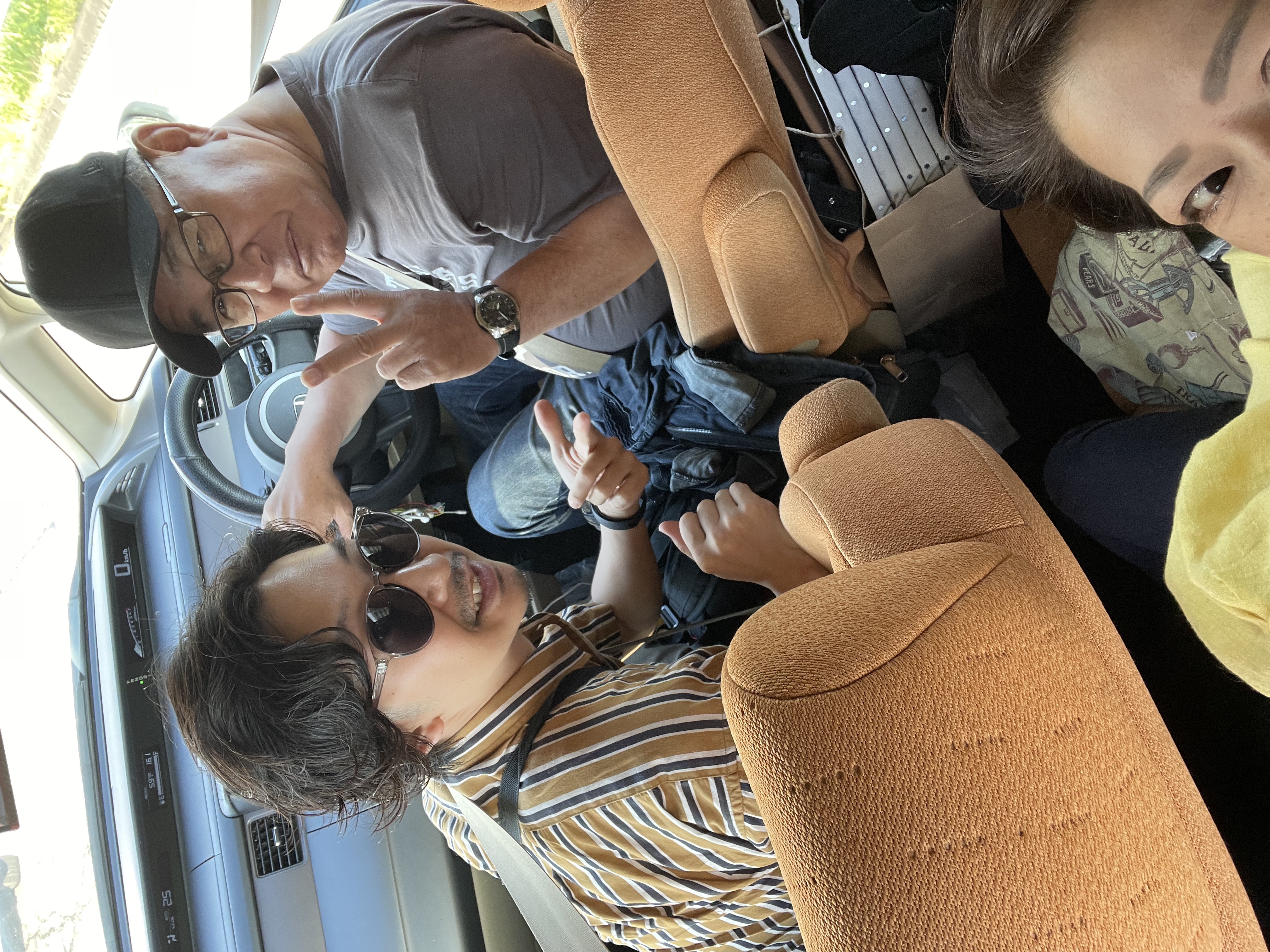 移動は全て車。後ろは全く見えないほどたくさんの荷物を積んだ車を、ずっと運転くださったbass北川弘幸さん。